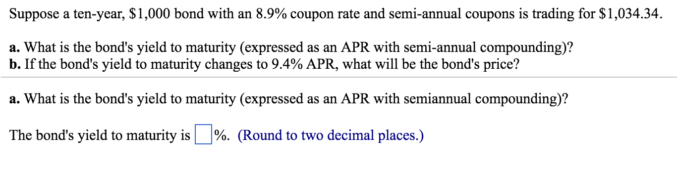 Semi-annual rate - ACT Wiki The semi-annual rate is the simple annual interest quotation for compounding twice a year. Coupon rates on bonds paying interest twice per year are generally expressed as semi-annual rates. This makes rates broadly comparable, while also enabling the amounts of fixed interest coupons to be determined easily. Example: Semi-annual rate calculation What Is Coupon Rate and How Do You Calculate It? Coupons can save you money on double stuffed Oreo cookies. They can make skee-ball seem like a good use of time. And they can help you save for retirement or college tuition. A bond with semi-annual to annual coupon payments can provide a steady stream of income with the right coupon rate. Buying a $1,000 Bond With a Coupon of 10% - Investopedia Most bonds pay interest semi-annually, which means bondholders receive two payments each year. 1 So with a $1,000 face value bond that has a 10% semi-annual coupon, you would receive $50 (5% x... Solved Suppose a seven-year, $1,000 bond with a 7% coupon ... Expert Answer No of periods = 7 years * 2 = 14 semi-annual periods Coupon per period = (Coupon rate / No of coupon payments per year) * Par value Coupon per period = (7% / 2) * $1000 Coupon per period = $35 a) Bond Price = Co … View the full answer Previous question Next question