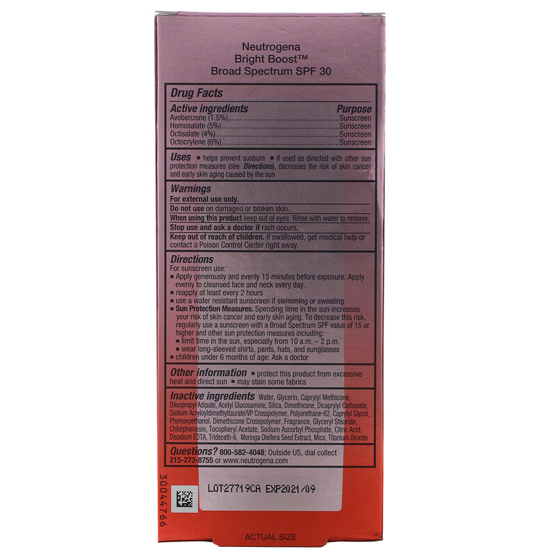 Neutrogena® 1 fl. oz. Bright Boost Moisturizer with Sunscreen SPF 30 ... Neutrogena Bright Boost Moisturizer with Sunscreen SPF 30 contains Neoglucosamine, designed to visibly reduce hyper pigmentation and dark spots and helps protect and moisturize skin while also improving skin tone.
