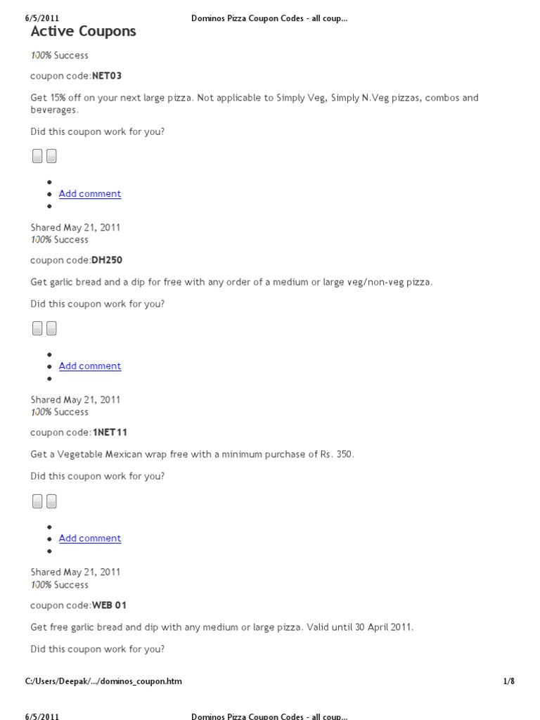 Domino's Pizza Coupons: Best Deals June 2022 - Coupon Blender Get access to exclusive Domino's Pizza coupons. Find Domino's Pizza June 2022 Verified Deals and Promos on CouponBlender Domino's Pizza Coupon Codes and Deals ... Specialty Chicken, Oven Baked Sandwich, Stuffed Cheesy Bread, 8-piece Boneless Chicken, or Pasta in a Dish for $5.99 each. works 100%. 682. Show Coupon Code. 20% . OFF COUPON CODE. 20 ...