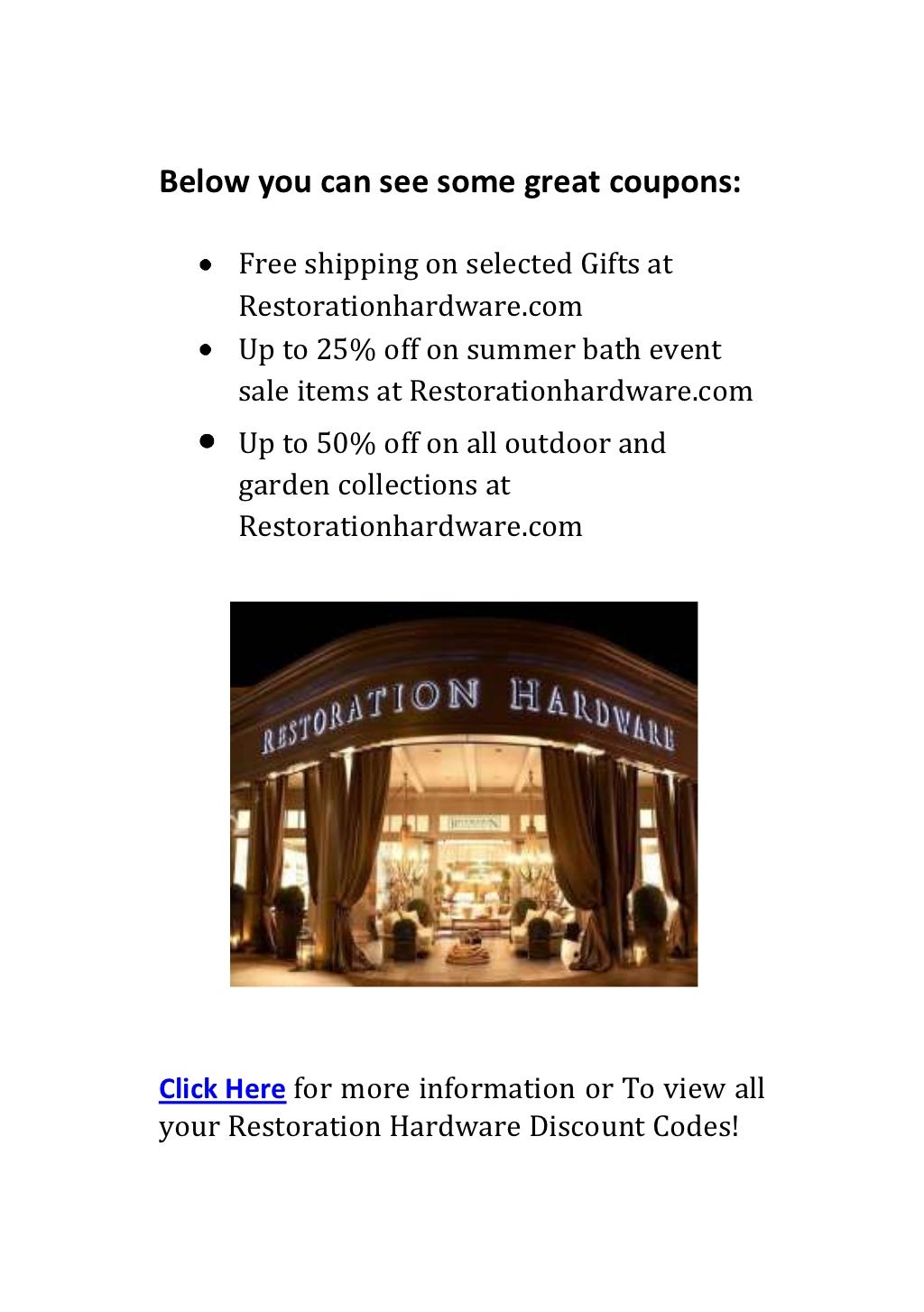 Restoration Hardware Promo Codes: Save $34 - Jul. 2022 Coupons Check out this Restoration Hardware coupon for $100 OFF on every $500 purchase Enjoy $100 off your purchase of $500+ at Restoration Hardware, good before April 7 only. GET COUPON More details Expired over one year ago IN-STORE $100 OFF $100 off every $500 purchase Use this offer by Dec 1 and you can get $100 off your order of $500+. GET COUPON